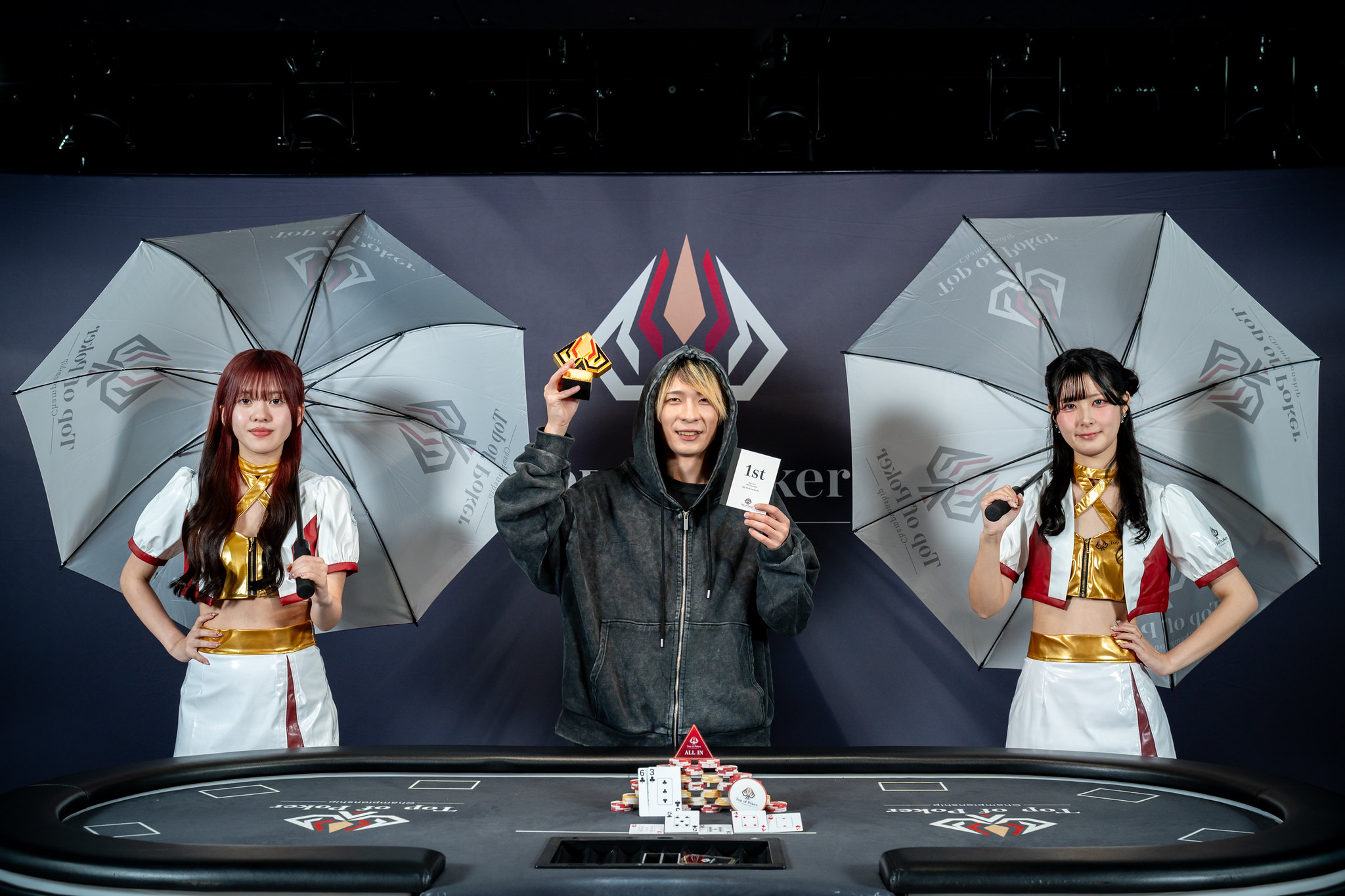 最後のハンドでは、相手のリンプに特大レイズしたらコールしてきて、フロップオープンエンドフラッシュドローになって、CBを打ったら相手がレイズオールインしてきたのでコールしたら優勝しました。