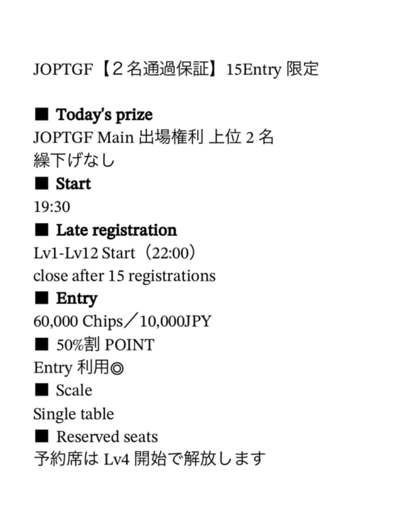 JOPTGF【2名通過保証】上限15Entry/1テーブル開催