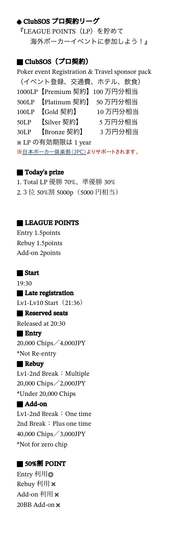 | ゲーム | 20,000点 / ノーリミット / テキサスホールデム / SOSPOKERオリジナル / オッズ良☆☆☆ |