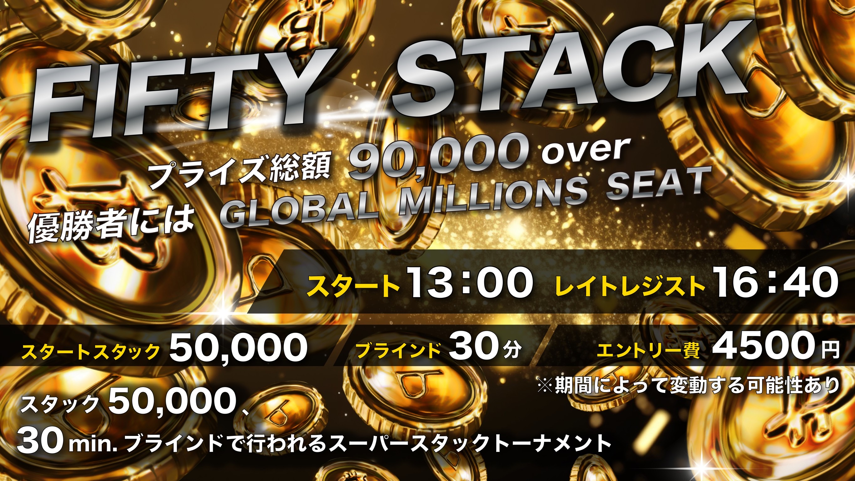 開始時間:13時00分 レイトレジスト :16時40分 エントリー:4,500円 リエントリー:4,500円 スタートスタック:50,000点 ブラインド:30分