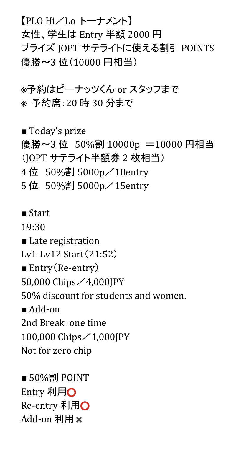 【PLO Hi/Lo トーナメント】女性、学生は半額2000円、プライズJOPTサテライトに使える割引POINTS優勝〜3位(10000円相当)