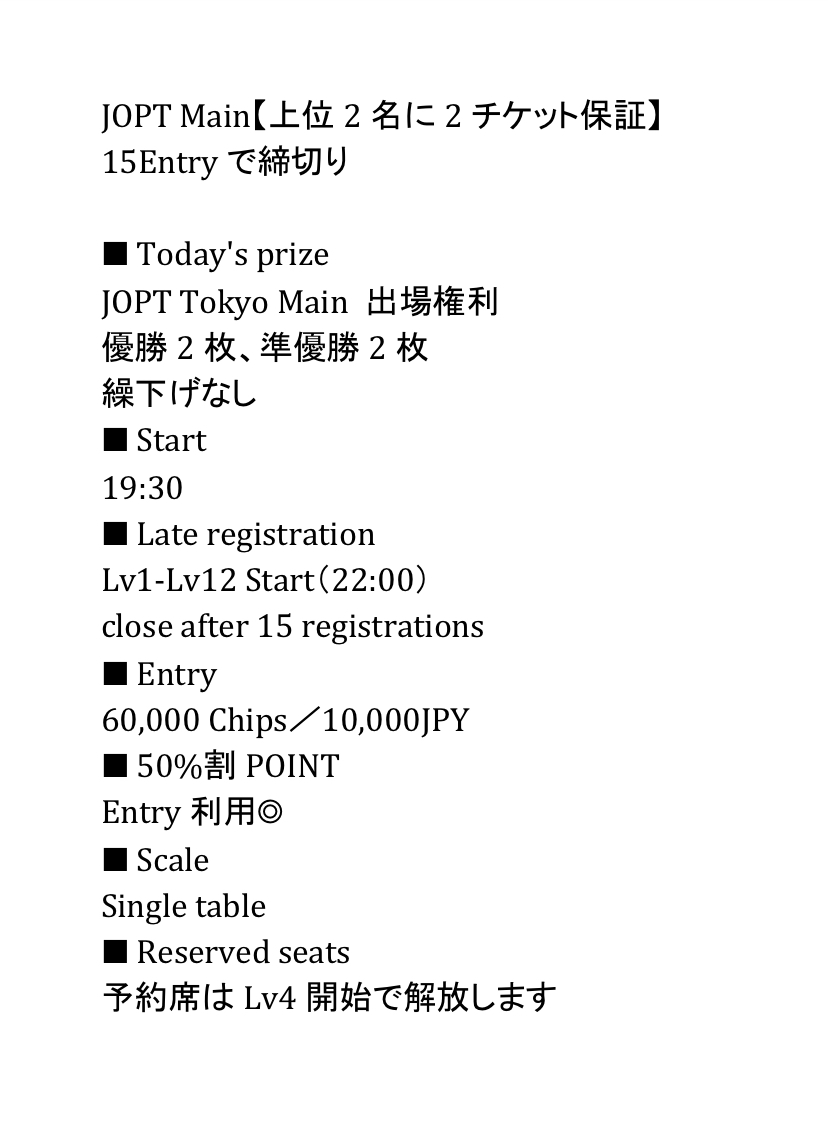 JOPT Main【上位2名に2チケット保証】 15Entryで締切り