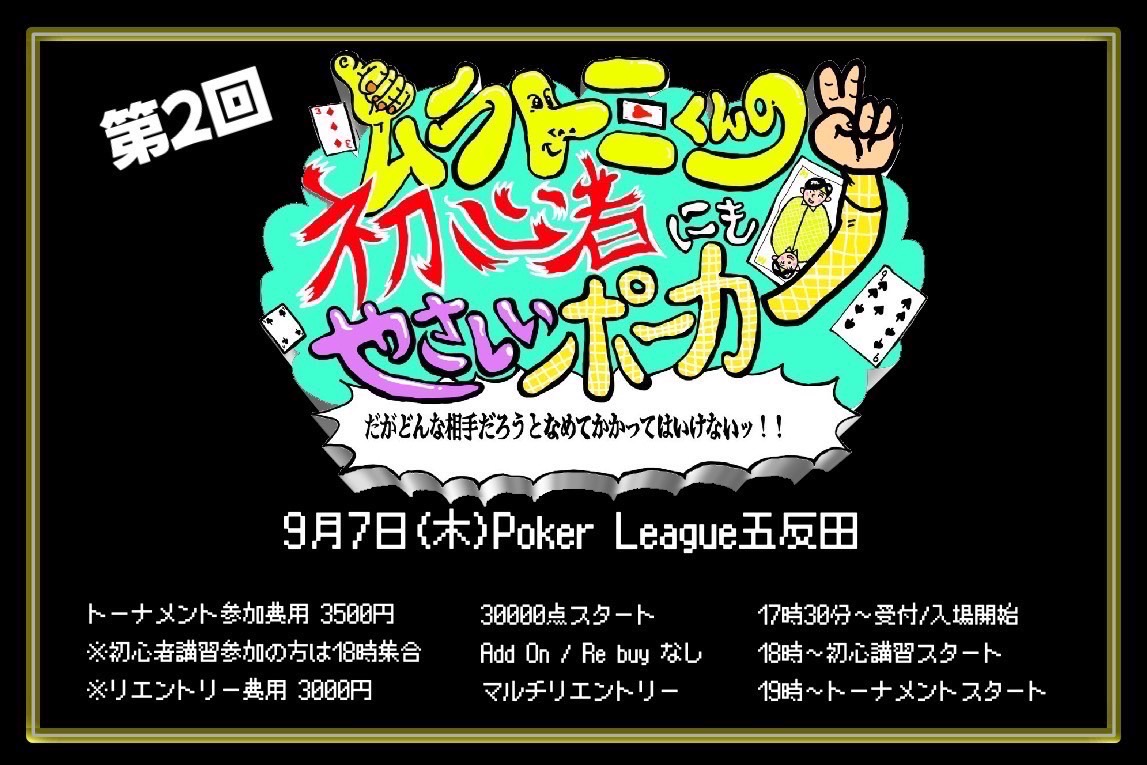 ポーカーを初めてやる方も初心者講習を受けて、19:00からのトーナメントに参加しよう!