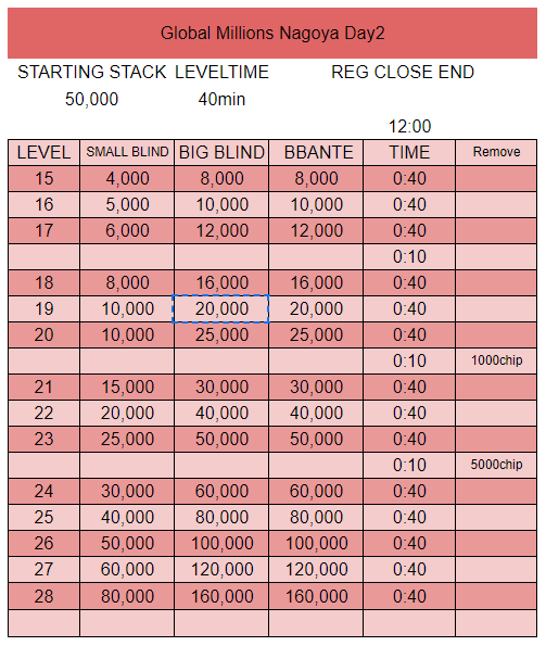 複数のDay1で勝ち残っているときは、もっとも多いチップをDay2に引き継ぎます。