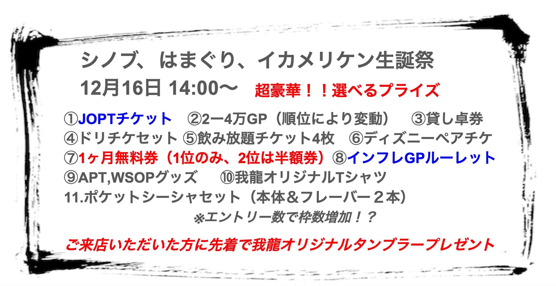 | 12/16(火) | 17:45 | 【JOPT 15チケット】メガサテライト | GoodGame Poker Live Shinjuku |