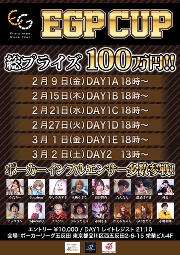 | 12/15(月) | 16:00 | 【JOPT】1000円で参加できる1卓限定 サテライト | EGP EBISU |