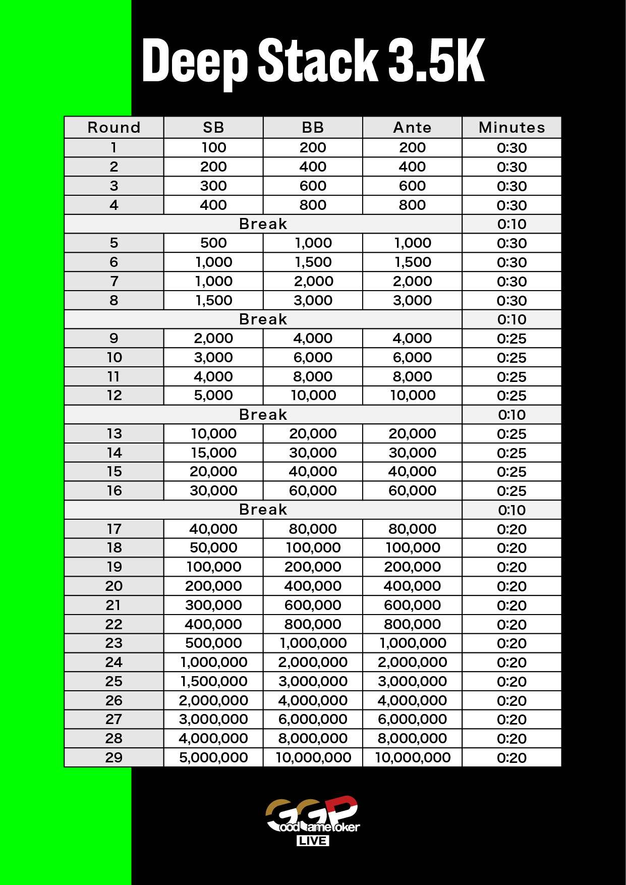 Deepstack 3.5k 最もポピュラーな30min.ブラインドで行われるディープスタック・トーナメント。 スキルを存分に発揮して、Coin ♠️Spadieチケットの獲得を目指せ。