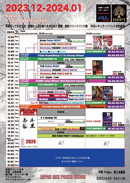 | 12/15(月) | 16:00 | 【JOPT】1000円で参加できる1卓限定 サテライト | EGP EBISU |