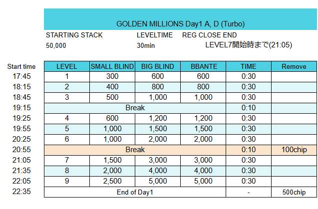 ②チップリーダー賞 DAY1通過時、チップリーダーの場合、ゴールデンミリオンチケットをお渡しします