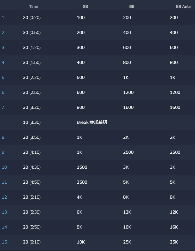 トーナメントディレクターの判断により、ストラクチャは当日変更になる場合がございます。