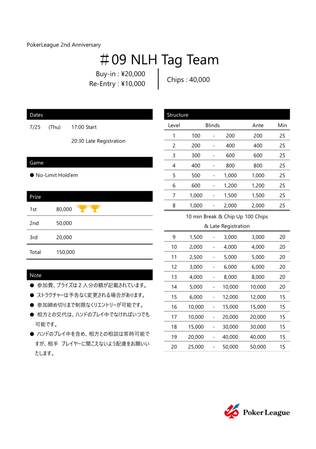 PokerLeague 2nd Anniversary 【#09 NLH Tag Team】