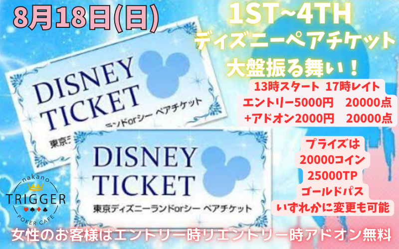 【女性アドオン無料】4位までもらえるディズニーペアチケットトーナメント
