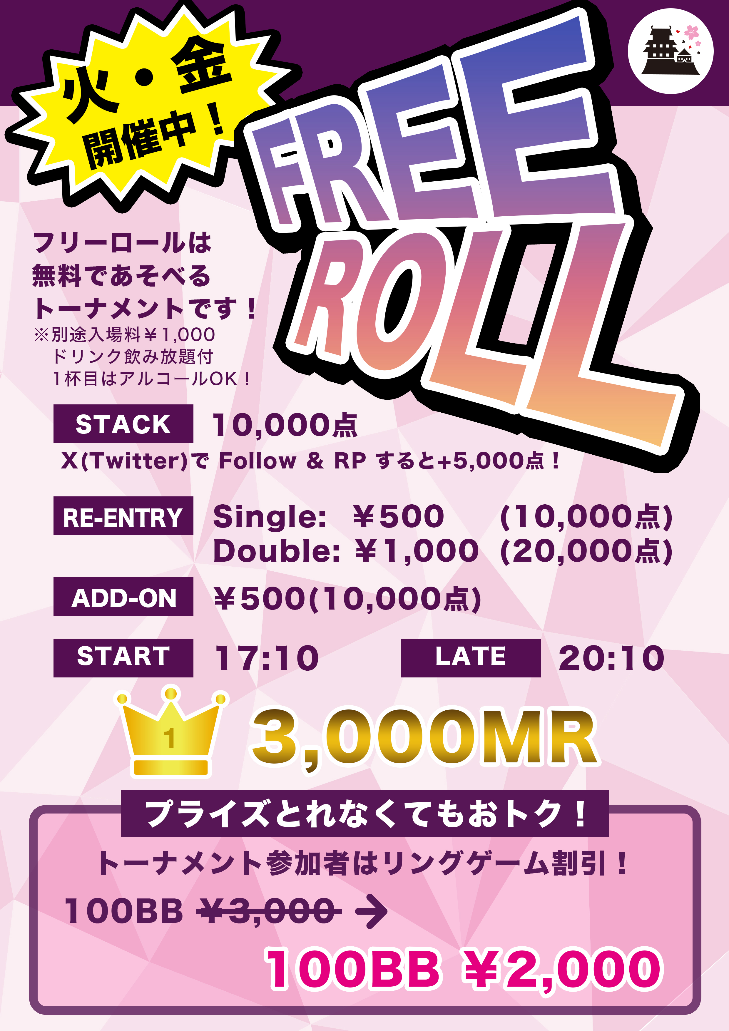 フリーロール【参加された方はリングゲームも1,000円割引!】