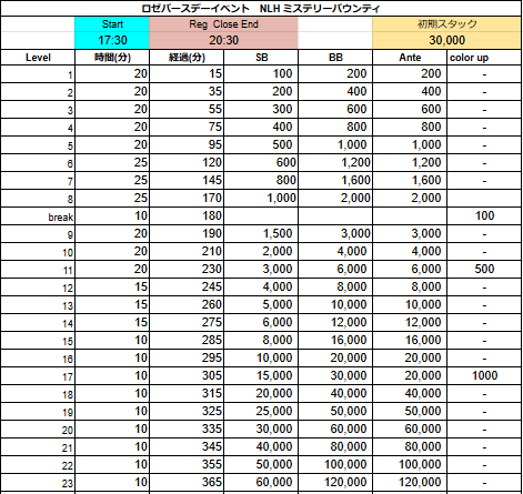 | ゲーム | 30,000点 / ノーリミット / テキサスホールデム / normal / Ticket |