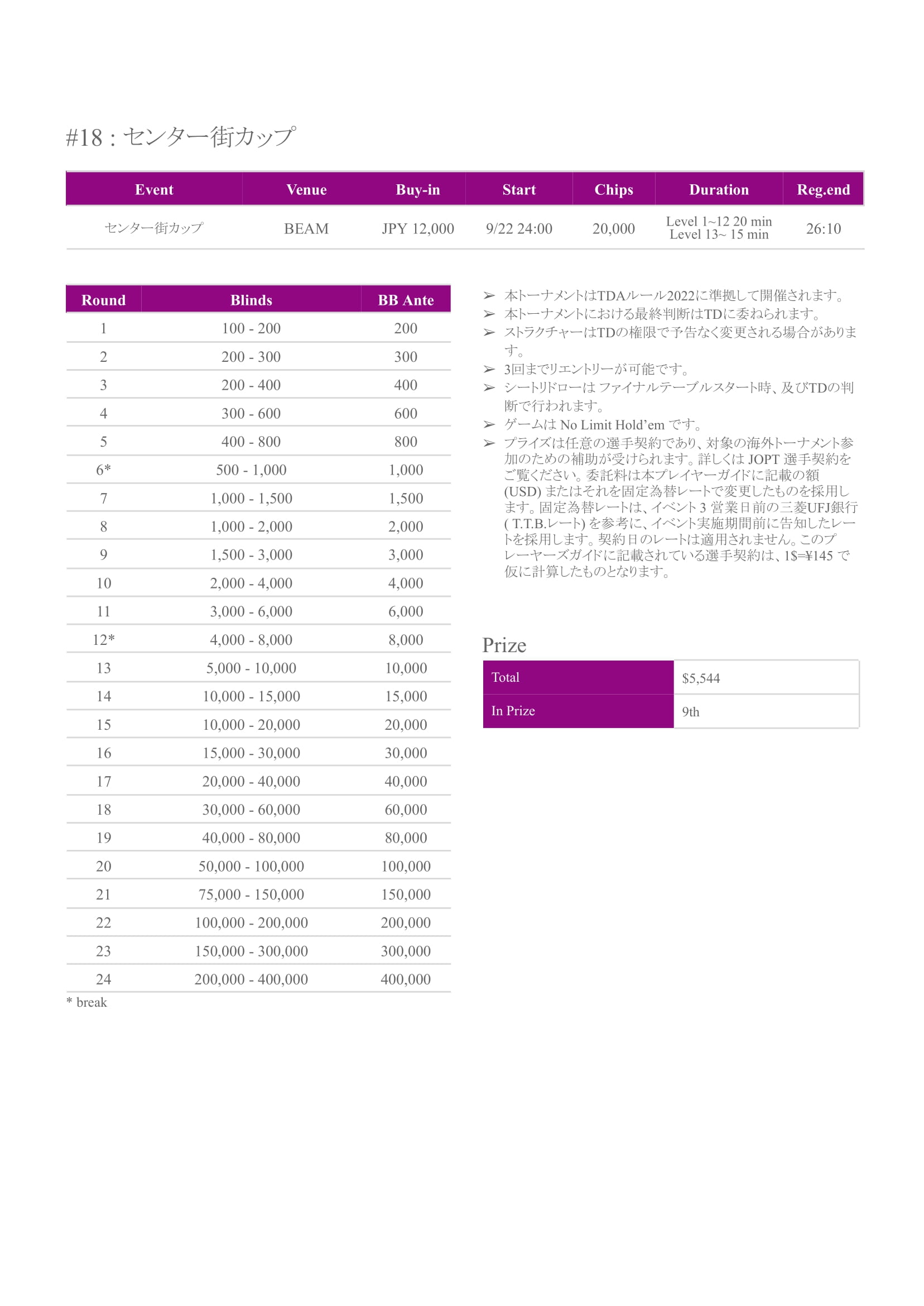 | 12/15(月) | 18:00 | 【JOPT 15Ticket】メガサテライト | Casino Live Tokyo |