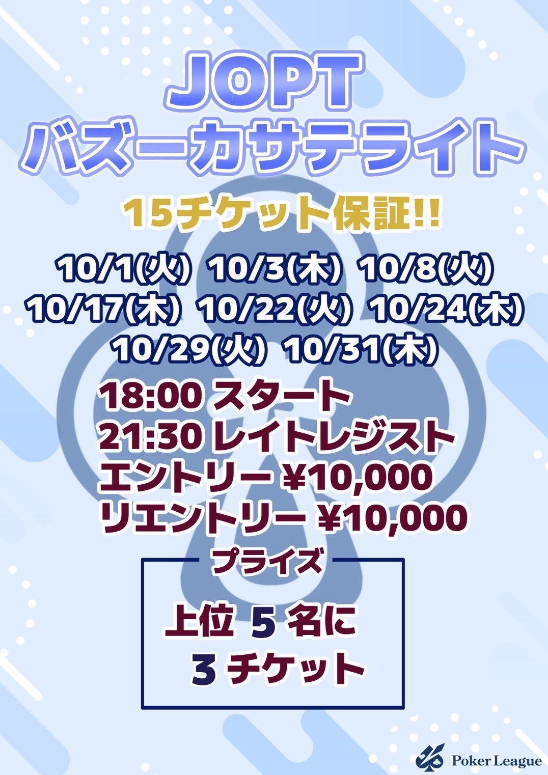 | 12/16(火) | 18:00 | 【JOPT 21チケット】サテライト 毎週火曜日開催✨ | GoodGame Poker Live SHIBUYA |