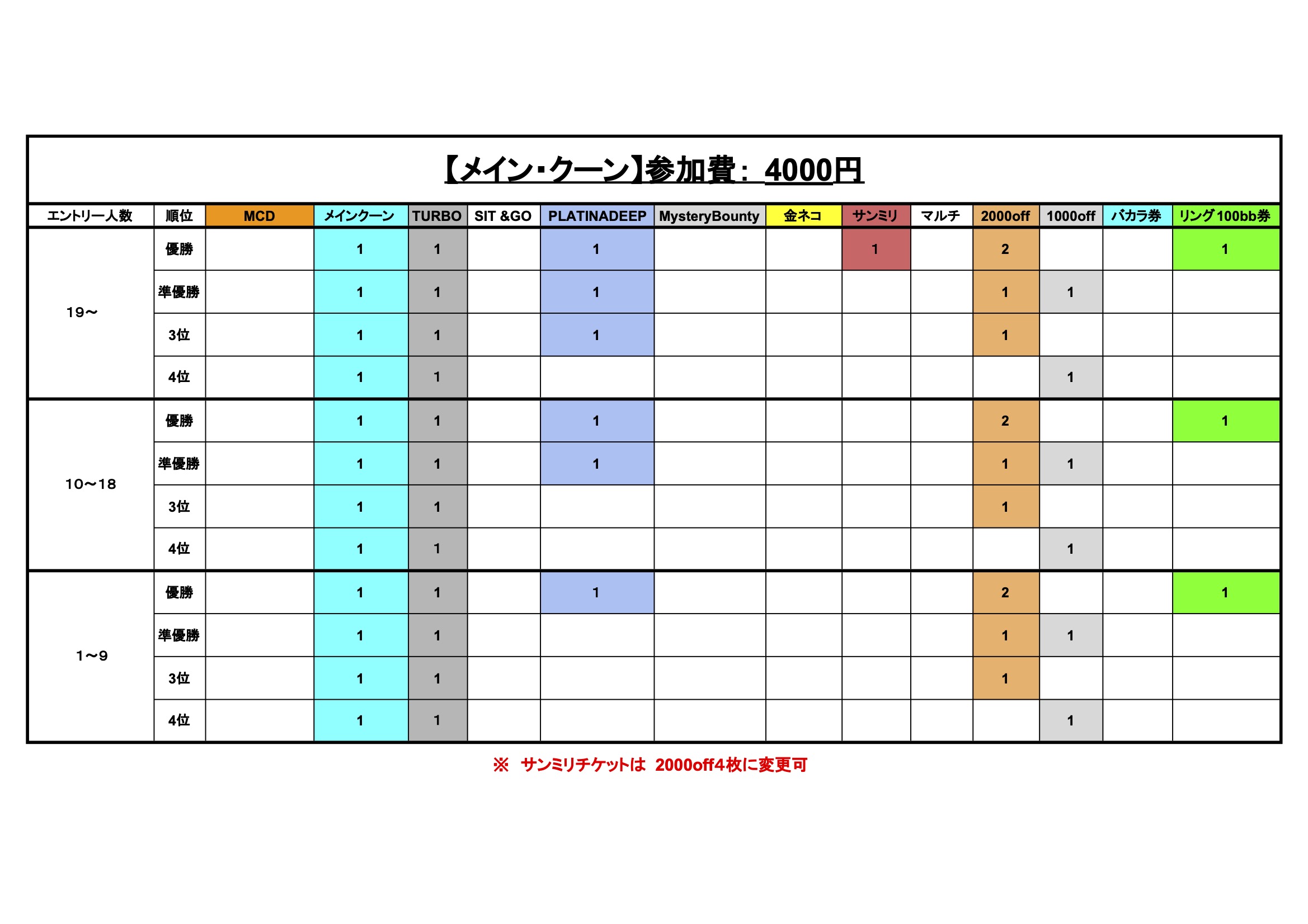 | ゲーム | 30,000点 / ノーリミット / テキサスホールデム / 20min / シート権利 |