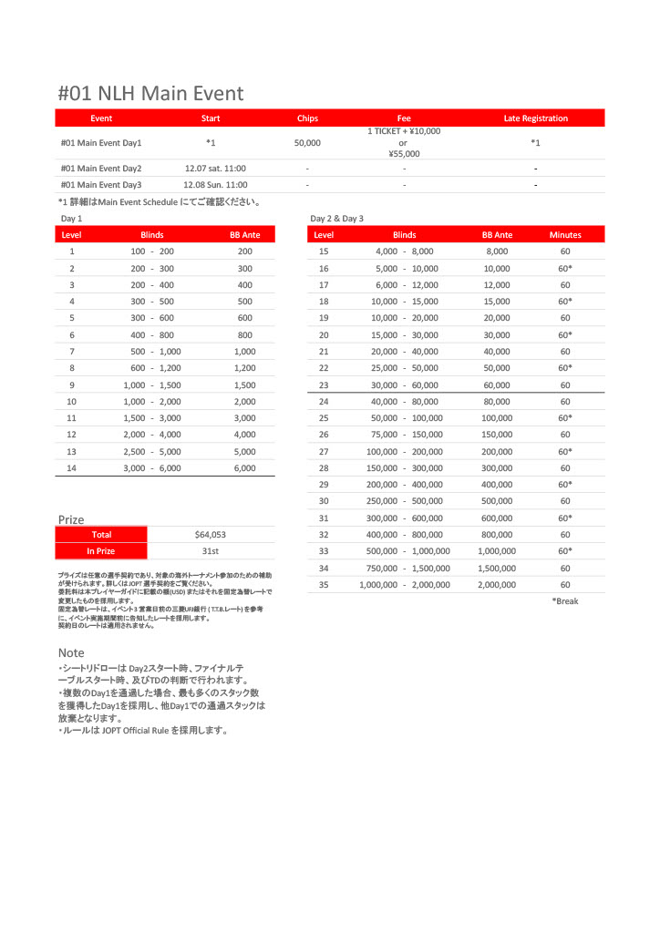| 12/15(月) | 18:00 | 【JOPT 15Ticket】メガサテライト | Casino Live Tokyo |
