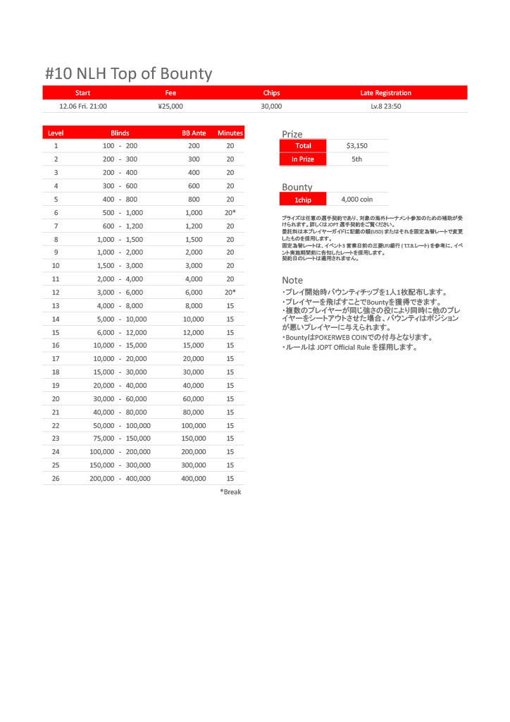 | 12/15(月) | 18:00 | 【JOPT 15Ticket】メガサテライト | Casino Live Tokyo |