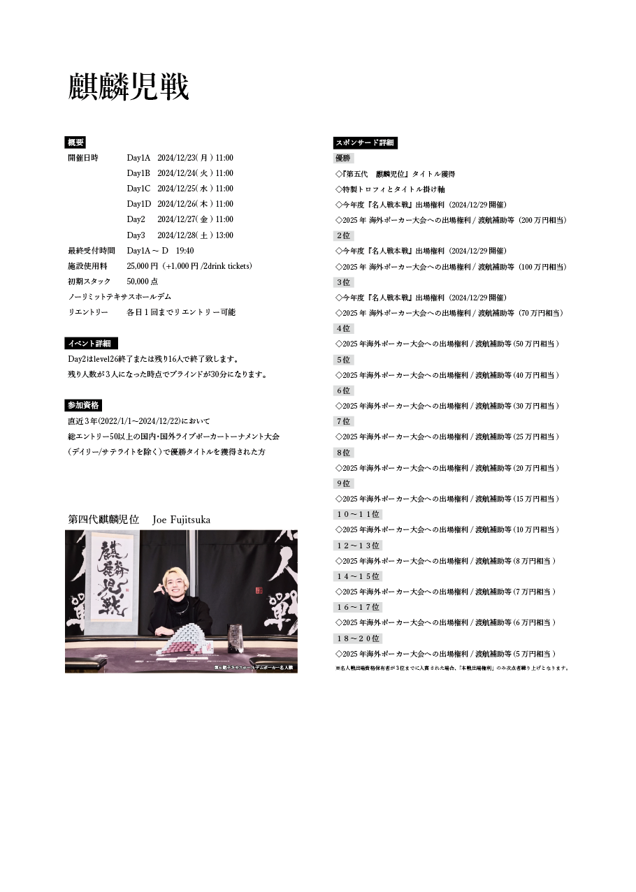 | 12/15(月) | 18:00 | 【JOPT 15Ticket】メガサテライト | Casino Live Tokyo |
