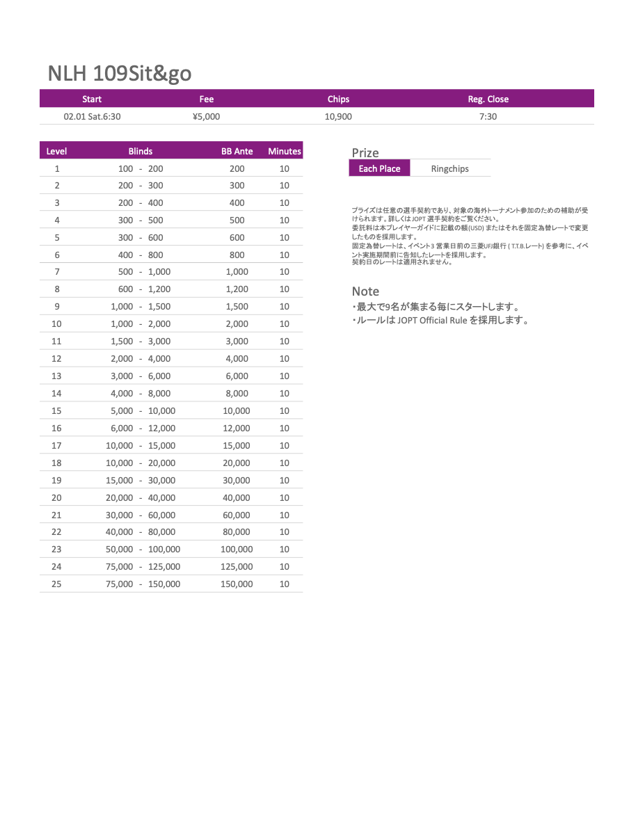 1.上位入賞されたプレイヤーには、プライズとして一般社団法人 日本ポーカー連盟との選手契約(業務委託契約)をオファーします。この選手契約は、本イベントを宣伝してもらうことを目的として、国内遠征費や国外トーナメントの参加費、渡航費などの経費を、委託料として一般社団法人 日本ポーカー連盟が負担するものです。この契約は任意となり、契約する際は、会場で当日中の契約のお手続きが必要です。詳しくはJOPT選手契約をご覧ください。