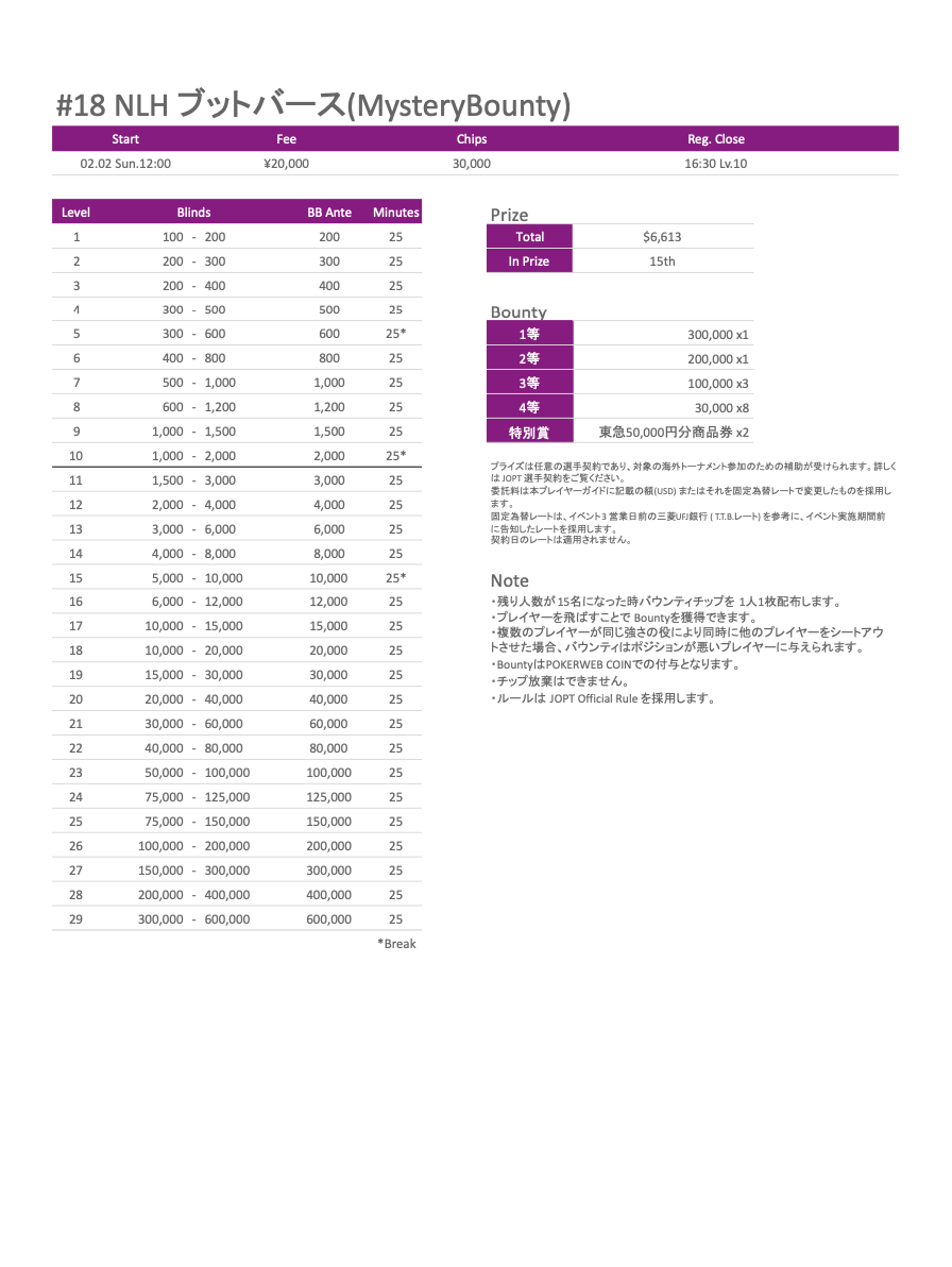 1.上位入賞されたプレイヤーには、プライズとして一般社団法人 日本ポーカー連盟との選手契約(業務委託契約)をオファーします。この選手契約は、本イベントを宣伝してもらうことを目的として、国内遠征費や国外トーナメントの参加費、渡航費などの経費を、委託料として一般社団法人 日本ポーカー連盟が負担するものです。この契約は任意となり、契約する際は、会場で当日中の契約のお手続きが必要です。詳しくはJOPT選手契約をご覧ください。