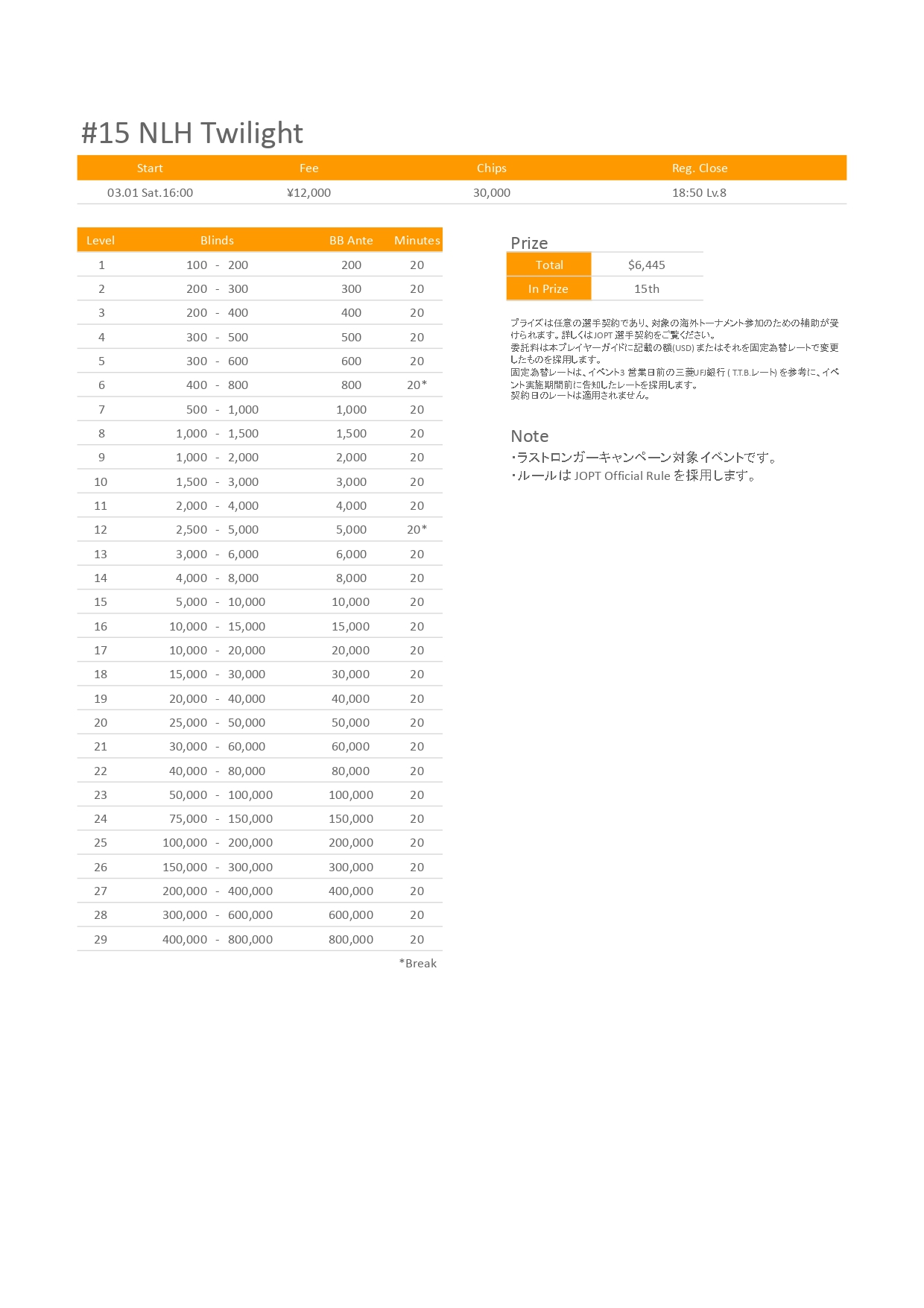 | 12/15(月) | 18:00 | 【JOPT 15Ticket】メガサテライト | Casino Live Tokyo |