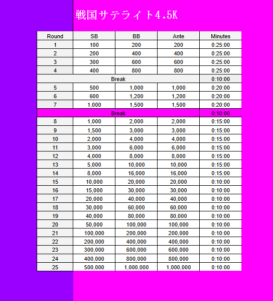| ゲーム | 30,000点 / ノーリミット / テキサスホールデム / 20Min. / 使用しない |