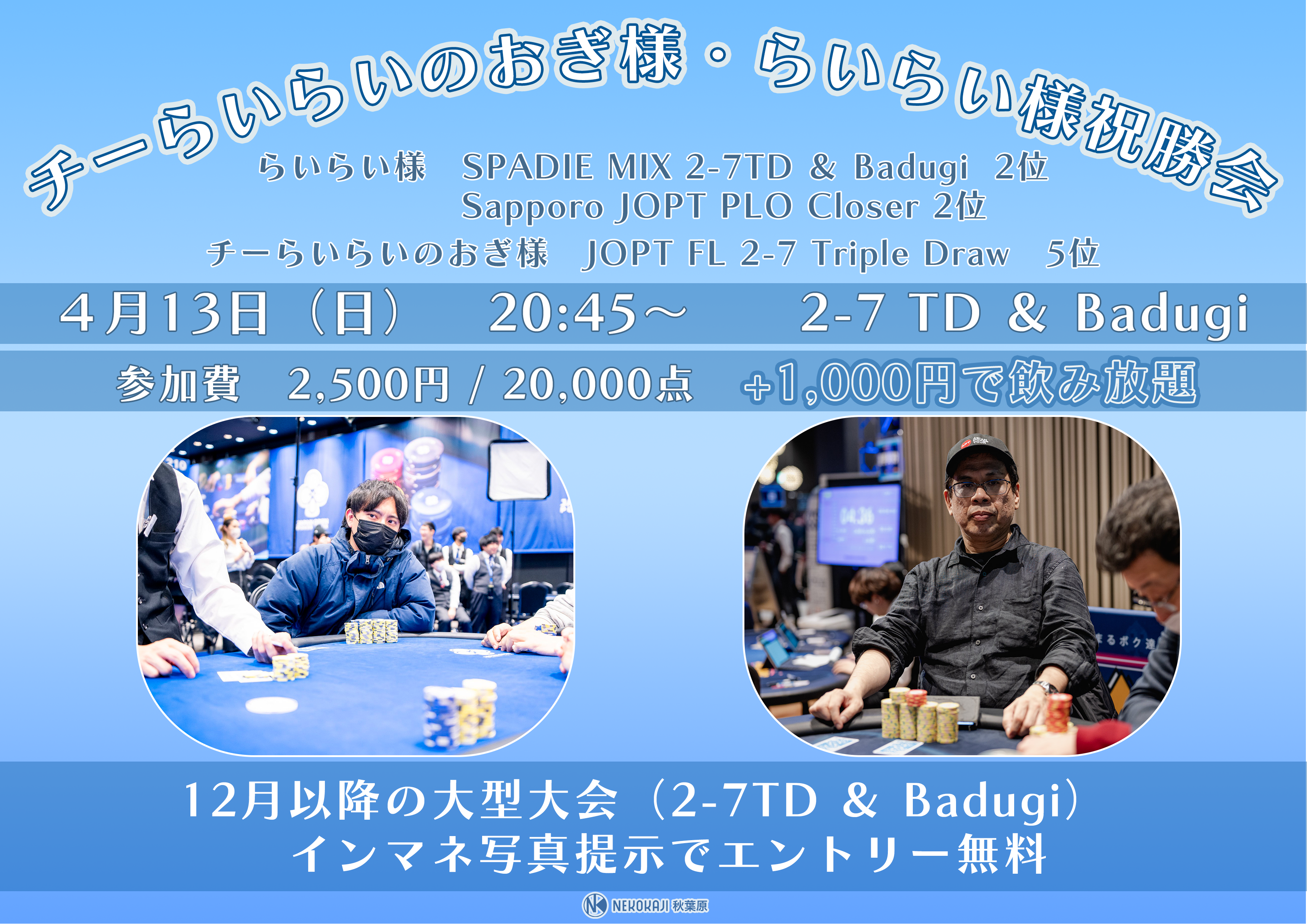| ゲーム | 20,000点 / ノーリミット / テキサスホールデム / 15Min. / ポイントなし |