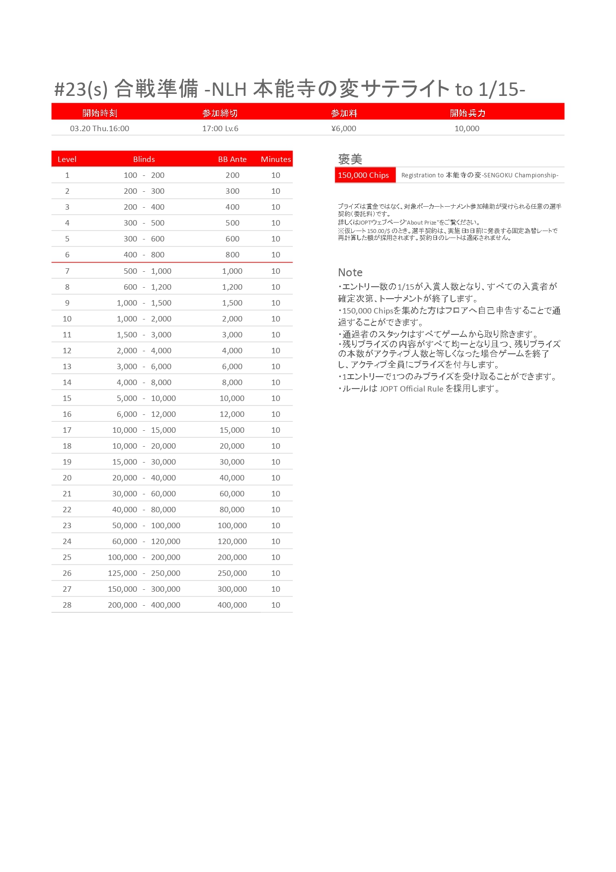 | 12/15(月) | 18:00 | 【JOPT 15Ticket】メガサテライト | Casino Live Tokyo |