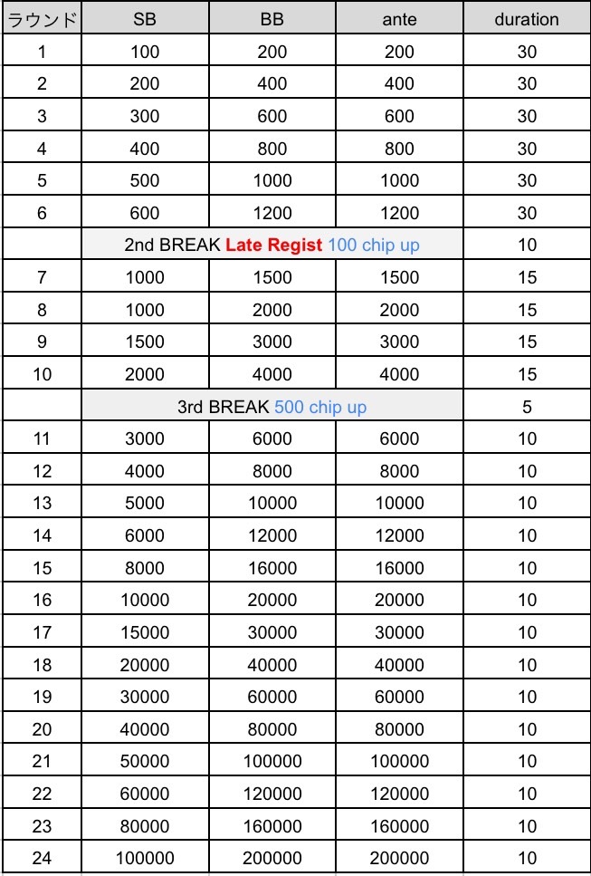 ※TD権限によりタイマースタート、ブラインド、ストラクチャーの変更となる場合がございます。