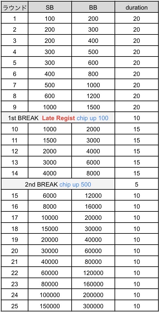 ※TD権限によりタイマースタート、ブラインド、ストラクチャーの変更となる場合がございます。