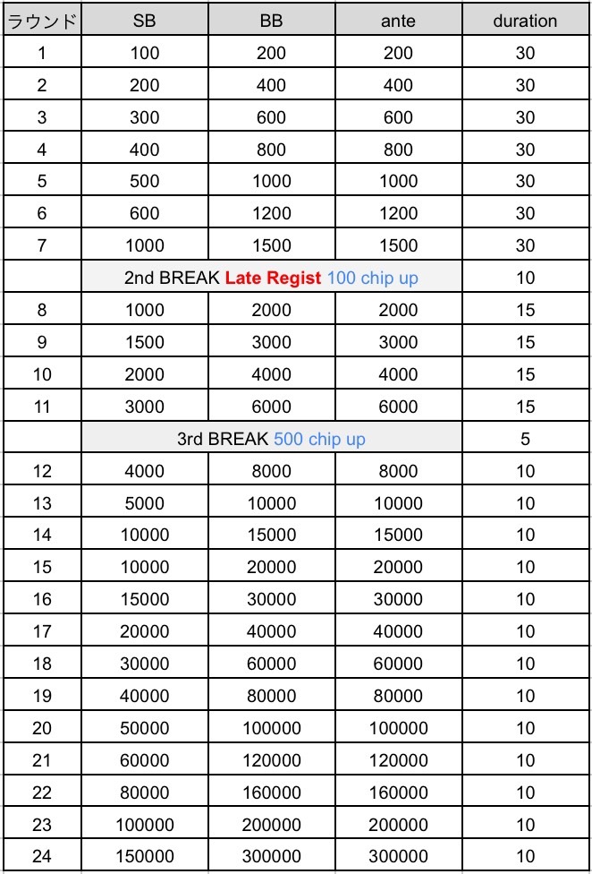 ※TD権限によりタイマースタート、ブラインド、ストラクチャーの変更となる場合がございます。