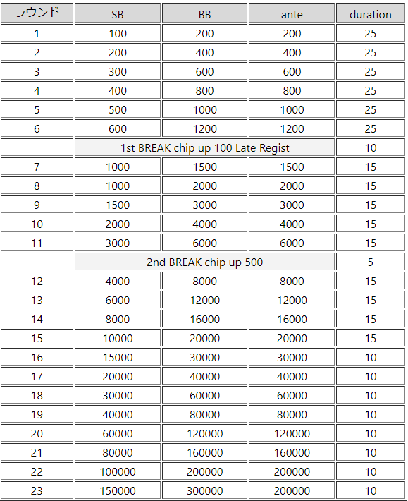 ※TD権限によりタイマースタート、ブラインド、ストラクチャーの変更となる場合がございます。