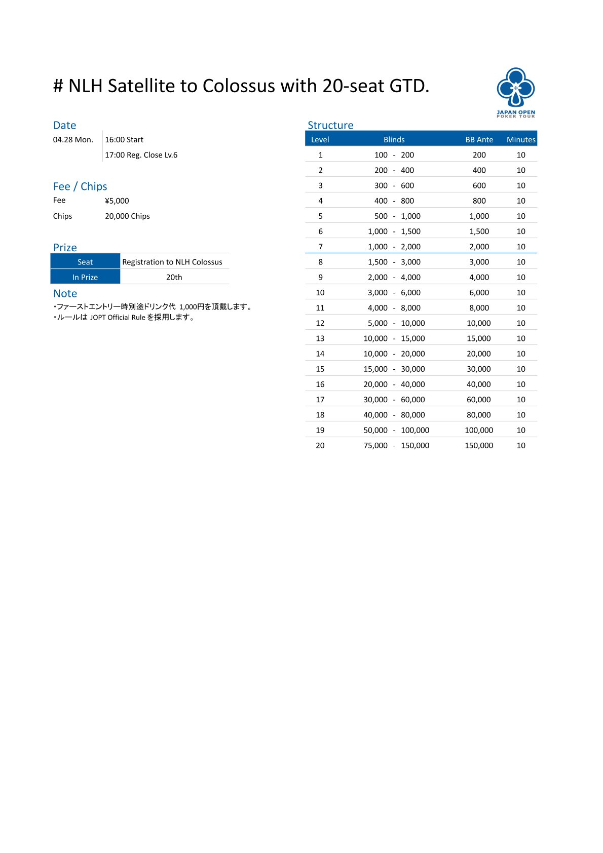 | 12/16(火) | 17:45 | 【JOPT 15チケット】メガサテライト | GoodGame Poker Live Shinjuku |