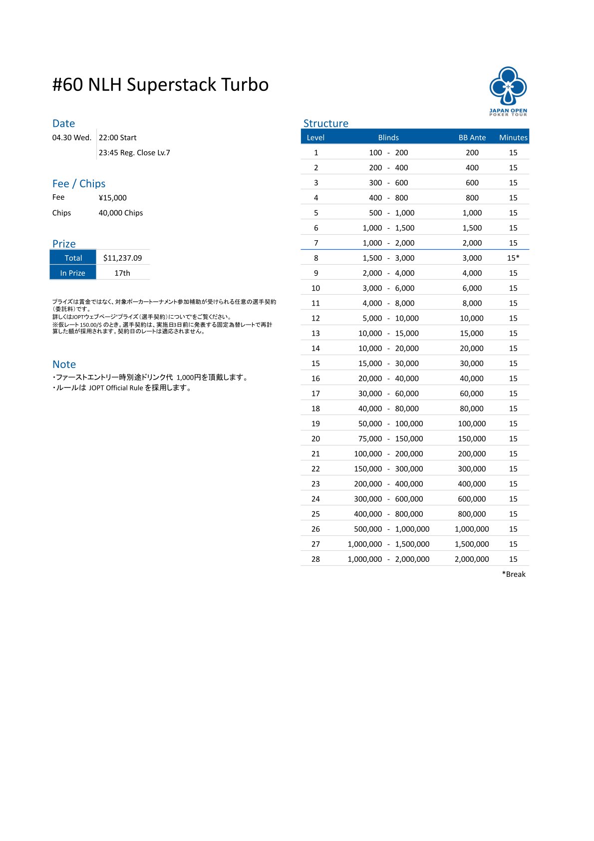 | 店舗名 | JAPAN OPEN POKER TOUR |