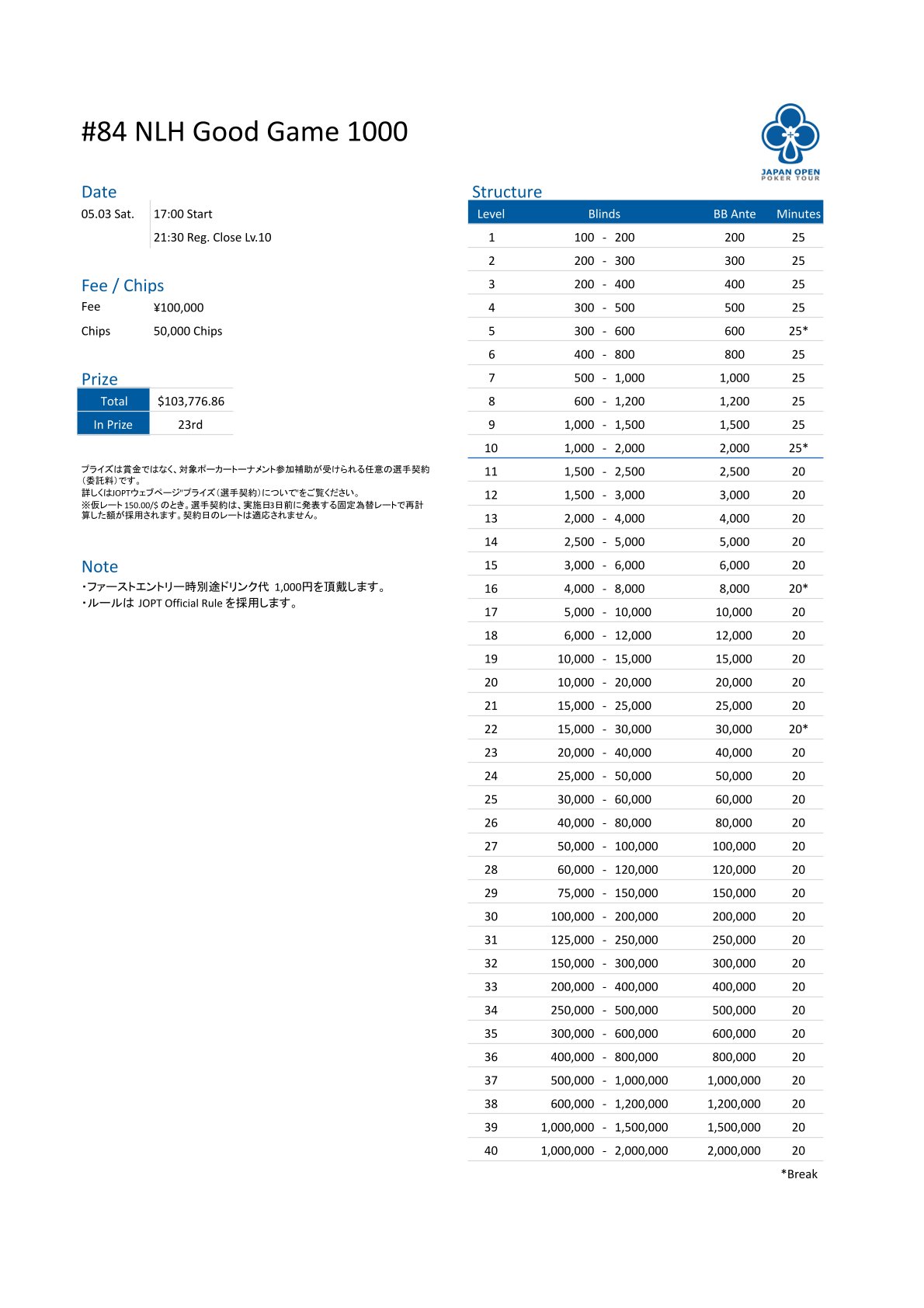 | 店舗名 | JAPAN OPEN POKER TOUR |