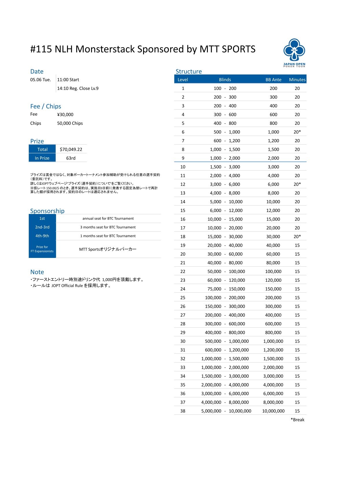 | 店舗名 | JAPAN OPEN POKER TOUR |