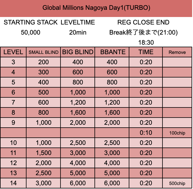 | ゲーム | 50,000点 / ノーリミット / テキサスホールデム / Turbo / Day1 |