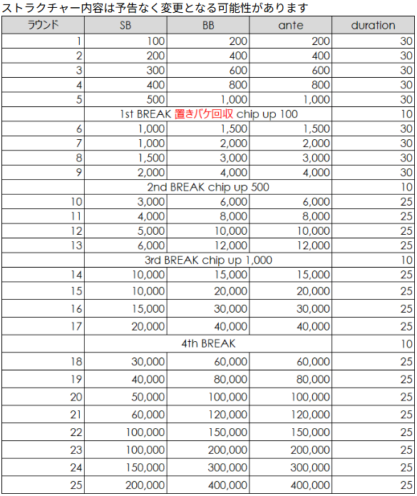※TD権限によりタイマースタート、ブラインド、ストラクチャーの変更となる場合がございます。