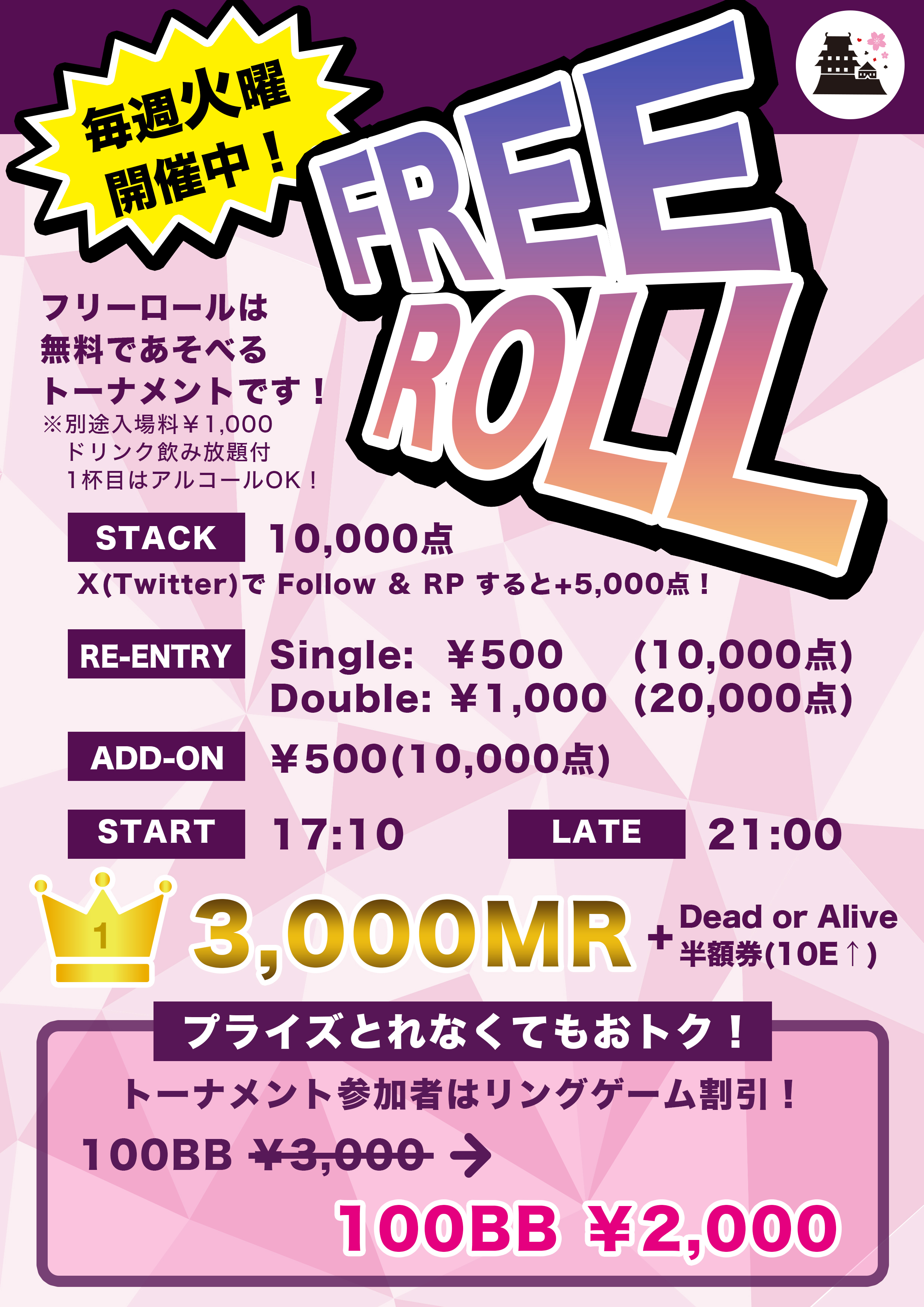 フリーロール【参加された方はリングゲームも1,000円割引!】