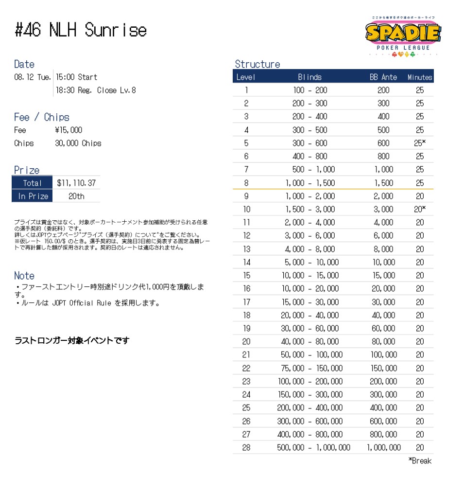 | 12/15(月) | 18:00 | 【JOPT 15Ticket】メガサテライト | Casino Live Tokyo |