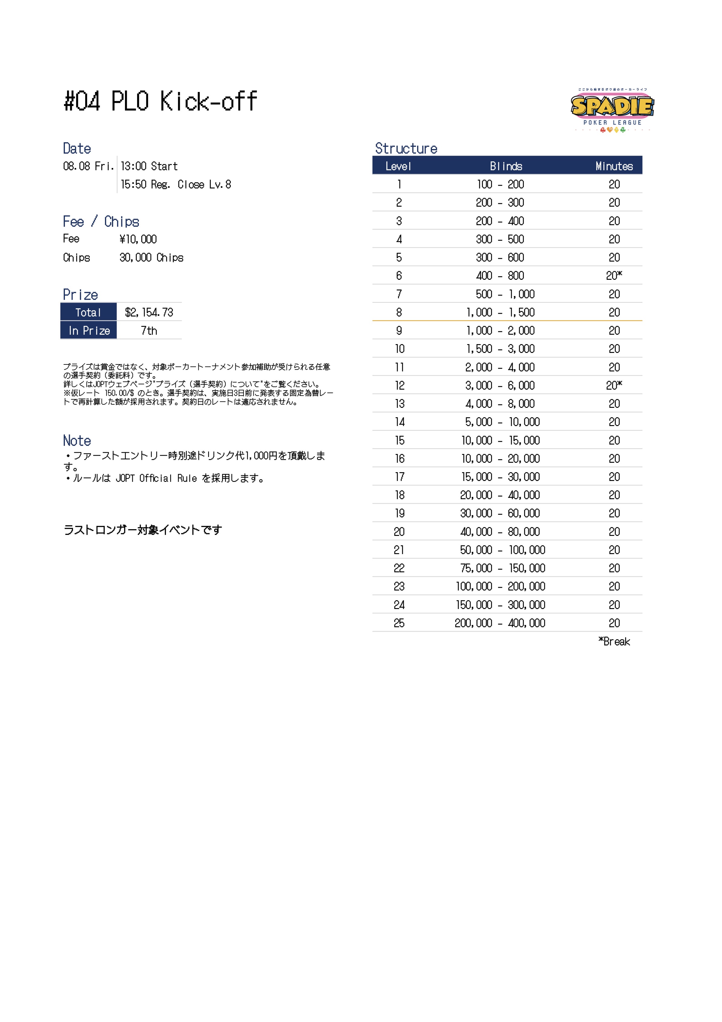 | ゲーム | 30,000点 / ポットリミット / オマハ / normal / Others |
