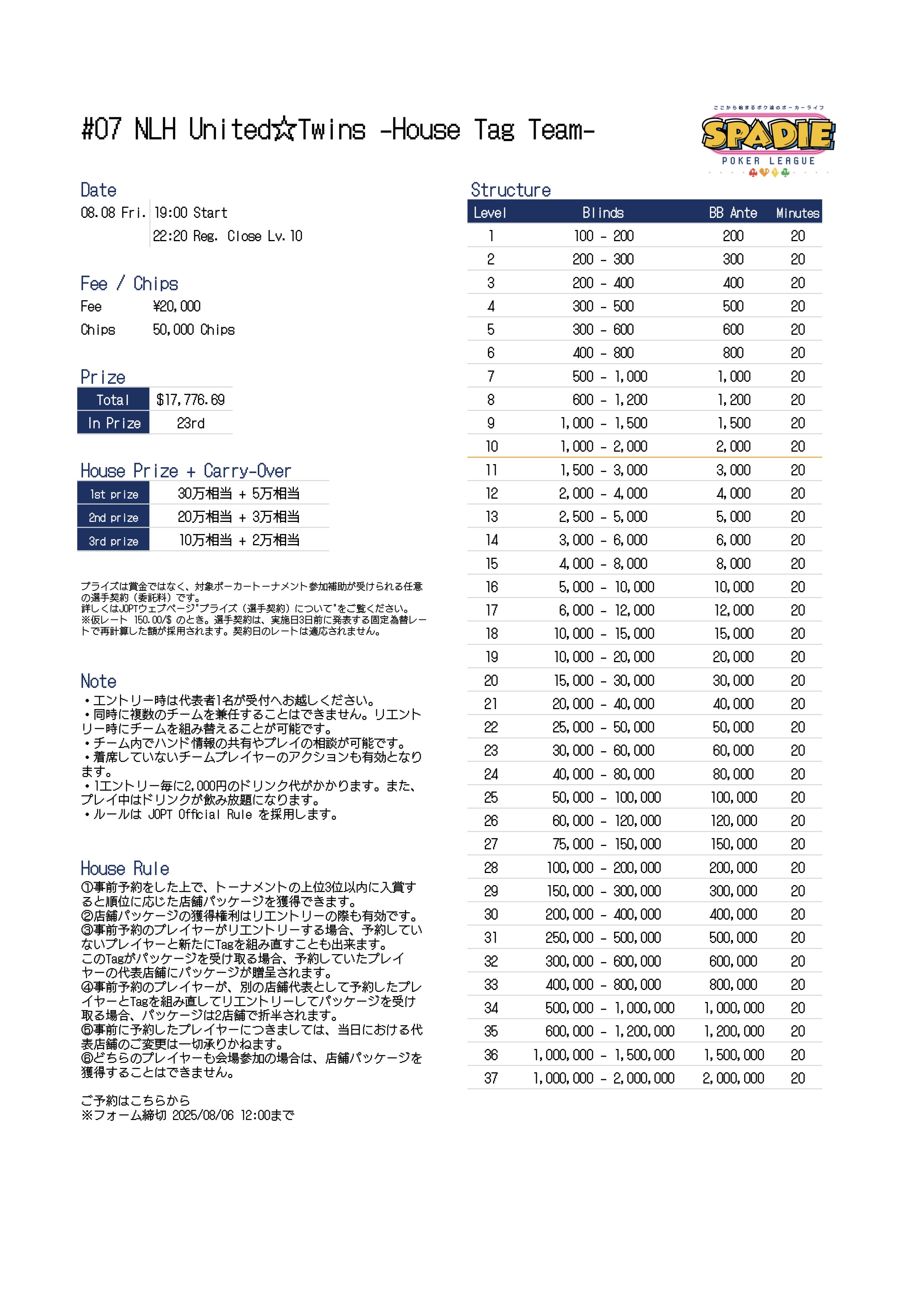 | 12/16(火) | 15:30 | 【♠︎SPADIE】Daily NLH 2K | 秋葉原カジノクエスト |