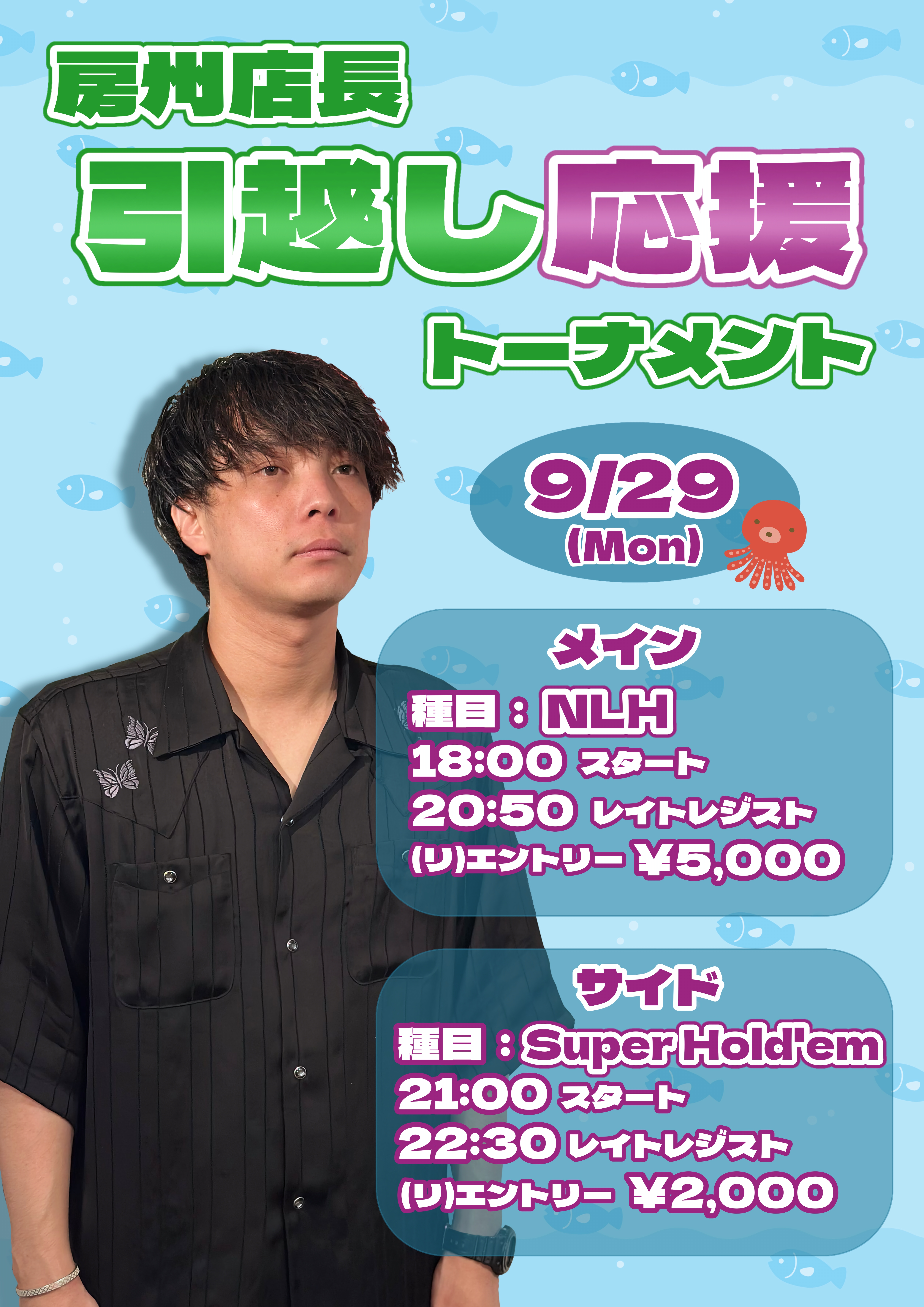 9月末で現住居の退去を強いられ、引っ越しを余儀なくされた房州店長の引越し資金を調達(応援)するためのトーナメントです!