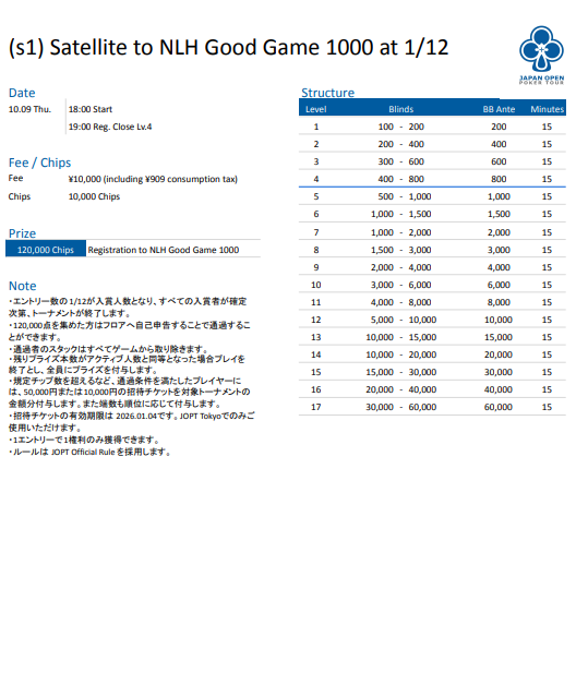 | 12/15(月) | 16:00 | 【JOPT】1000円で参加できる1卓限定 サテライト | EGP EBISU |