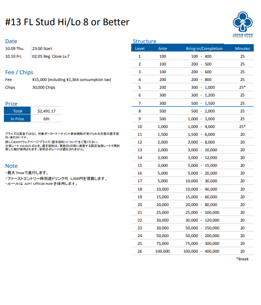 | 店舗名 | JAPAN OPEN POKER TOUR |