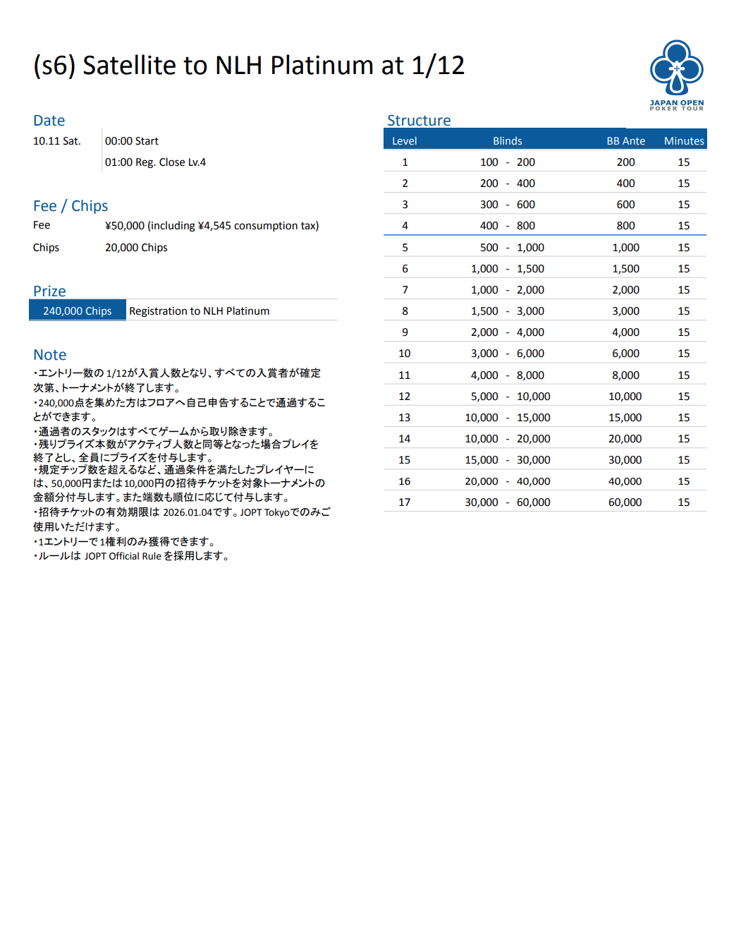 | 12/15(月) | 18:00 | 【JOPT 15Ticket】メガサテライト | Casino Live Tokyo |