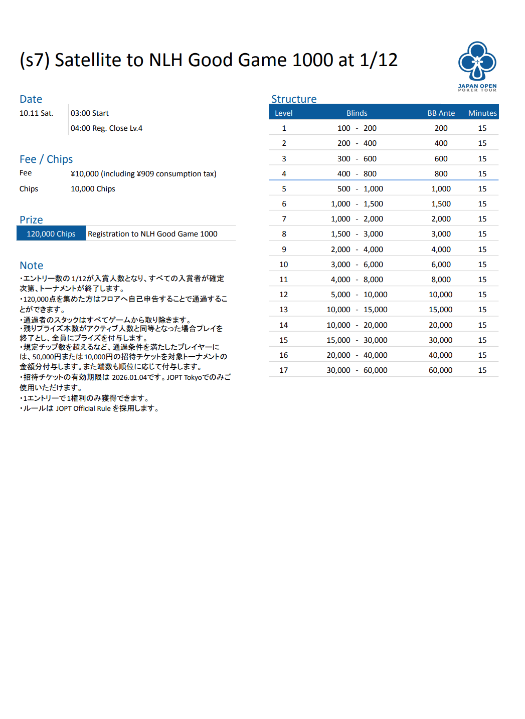 | 12/15(月) | 16:00 | 【JOPT】1000円で参加できる1卓限定 サテライト | EGP EBISU |