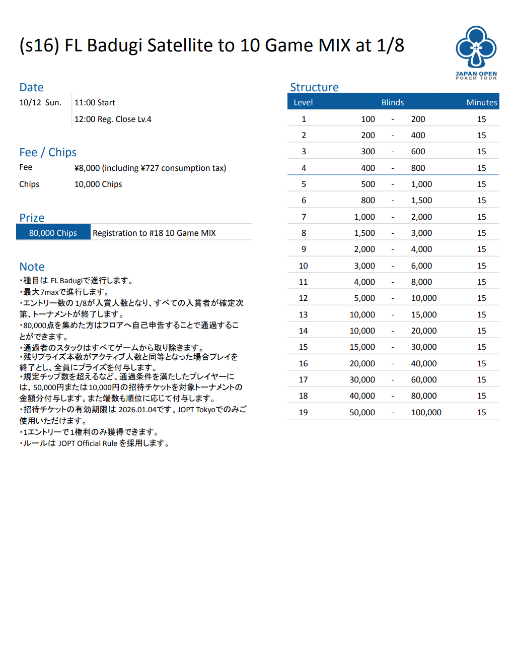 | 12/15(月) | 16:00 | 【JOPT】1000円で参加できる1卓限定 サテライト | EGP EBISU |